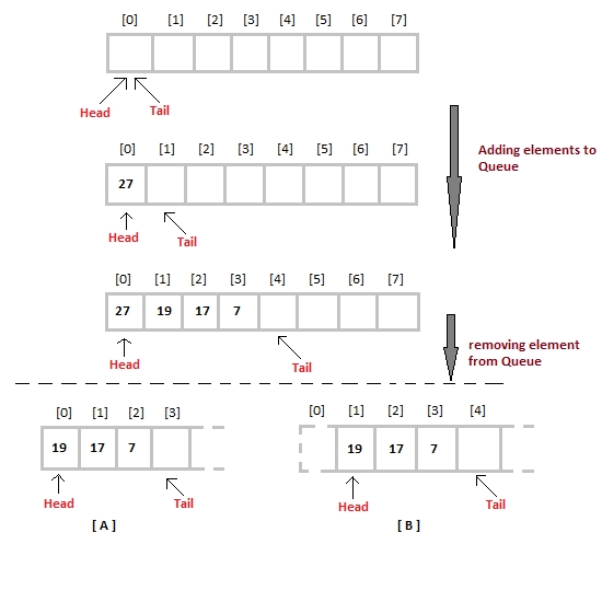 When we remove an element from Queue, we can follow two possible approaches (mentioned [A] and [B] in above diagram). In [A] approach, we remove the element at head position, and then one by one shift all the other elements in forward position.